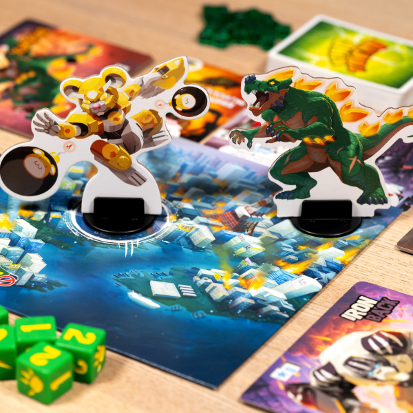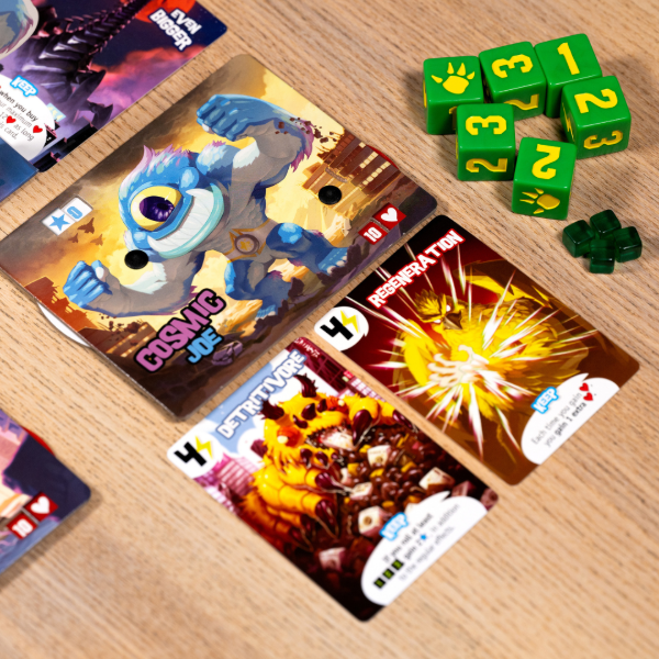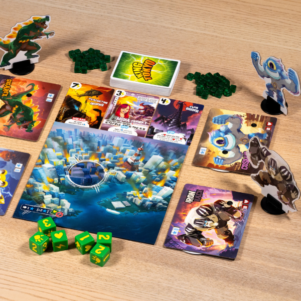 En un turno, tira seis dados con los siguientes seis símbolos: 1, 2 o 3 puntos, energía, curación y ataque. En tres tiradas consecutivas, elige si conservar o descartar cada dado para ganar puntos, ganar energía, recuperar salud o atacar a otros jugadores. Al atacar, si estás fuera de Tokio, golpeas a quien esté en Tokio; si estás en Tokio, ¡golpeas a todos los demás! Si la salud de alguien baja a 0, queda fuera de la partida. (No puedes curarte mientras estás en Tokio, y la única forma de salir de la ciudad es que alguien te ataque... lo que podría ponerte al borde de la muerte).